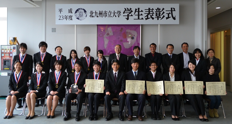 平成24年2月28日、北九州市立大学の「学生表彰式」が行われました。 今年度は7個人1団体が表彰され、藤山君が表彰されました。 社団法人環境科学会2011年会での最優秀発表賞(富士電機賞)を受賞したことが評価されました。 学生表彰式の報告はひびきの通信の2012年3月6日(http://office.env.kitakyu-u.ac.jp/blog/2012/03/23.html)の記事でも紹介されています! |